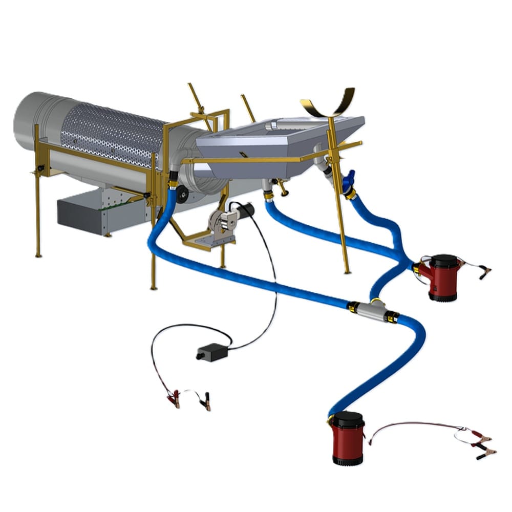 The KT10DC runs off of two 12 Volt DC pumps and a 12 volt motor. The two RP2200 pumps provide the water pressure for the DC motor to spin the drum. It can run roughly 6 hours on a 12 volt battery making it ideal for maintaining a silent, low profile operation or when gas engines are not allowed. Use at the water’s edge. The KT10 feed hopper sets roughly 2.5 feet above ground making it easier to shovel into and set buckets on the support for a easy controlled feed. The trommel is a pleasure to work with since the tailings are kicked out 5 feet away keeping you dry.