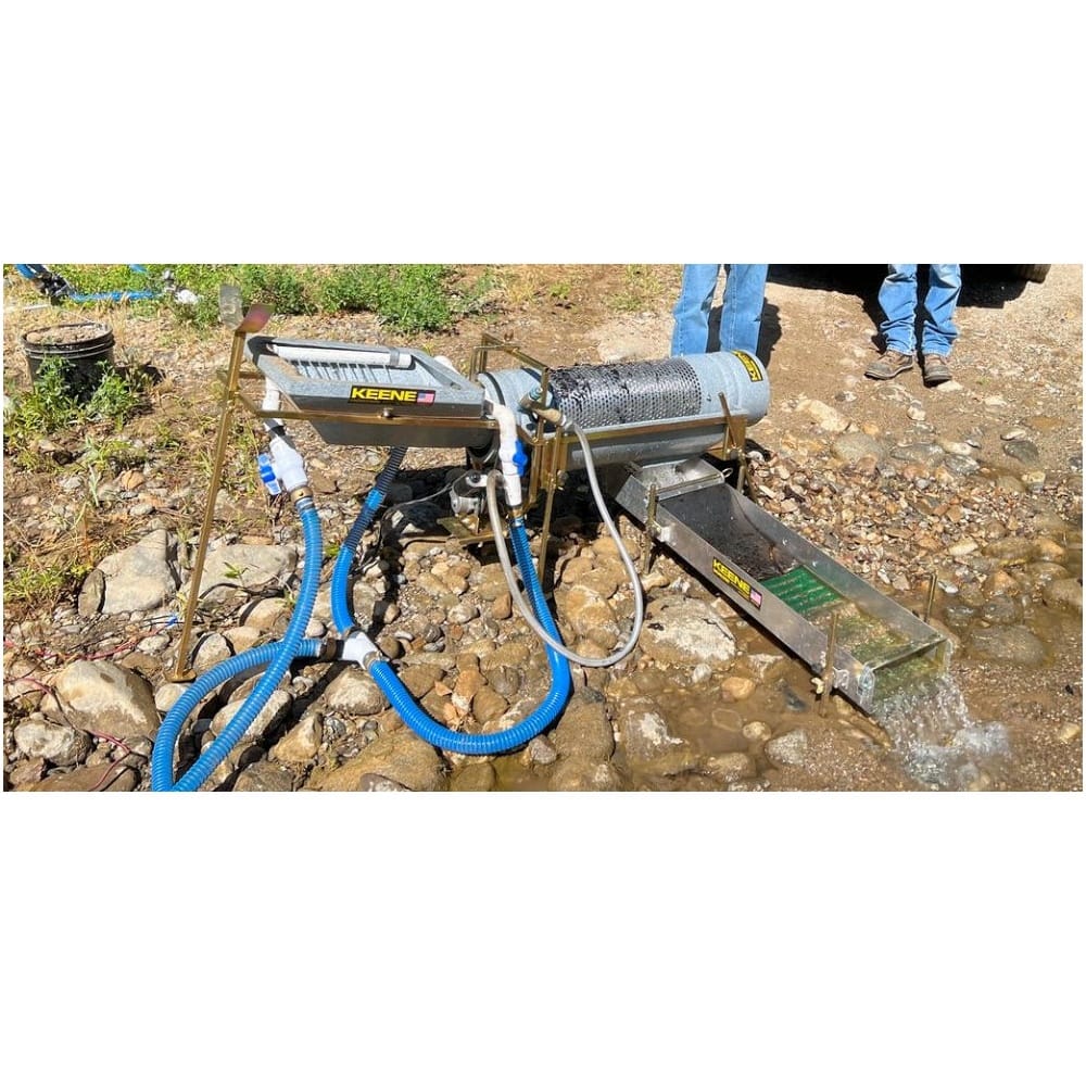 The KT10 Trommel is ideal for tough materials such as high clay content, heavily rooted material and compacted gravels. The material is fed and washed in the feed hopper that flows into the classifier drum. The drum, with the spray bars and breaker bars, thoroughly washes and classifies the material creating ideal conditions for optimum fine gold recovery in any sluice. The KT10 is capable of moving serious amounts of material of up to one yard per hour, keeping a one or two man crew busy. The feed hopper, belly pan and drum end caps are constructed out of a tough polyethylene cross link plastic incorporating designs you can only get out of a mold. Keene put a lot of thought and testing before they built these molds and everything works flawlessly. Keene fabricated the drum out of an aluminum punch plate with replaceable drums with a variety of sizes (such as 3/8” ¼” and ½”) for different applications. There are unique flipper bars that can be modified and even removed for different materials. The 5 adjustable articulating legs allow the machine to be set up in the most adverse conditions in just a few minutes also fine tuning only takes seconds. The sluice box can run out either side making it faster and easier to set up, plus you have a perfect view to watch the sluice box load while feeding. Keene recommends the KT10SA sluice box adaptor which attaches to their 10” wide sluice box (A52 or A52S). This makes a longer sluice box with Miracle Matting, expanded metal, 1/8th inch classifier and a long rubber mat to smooth out the flow.